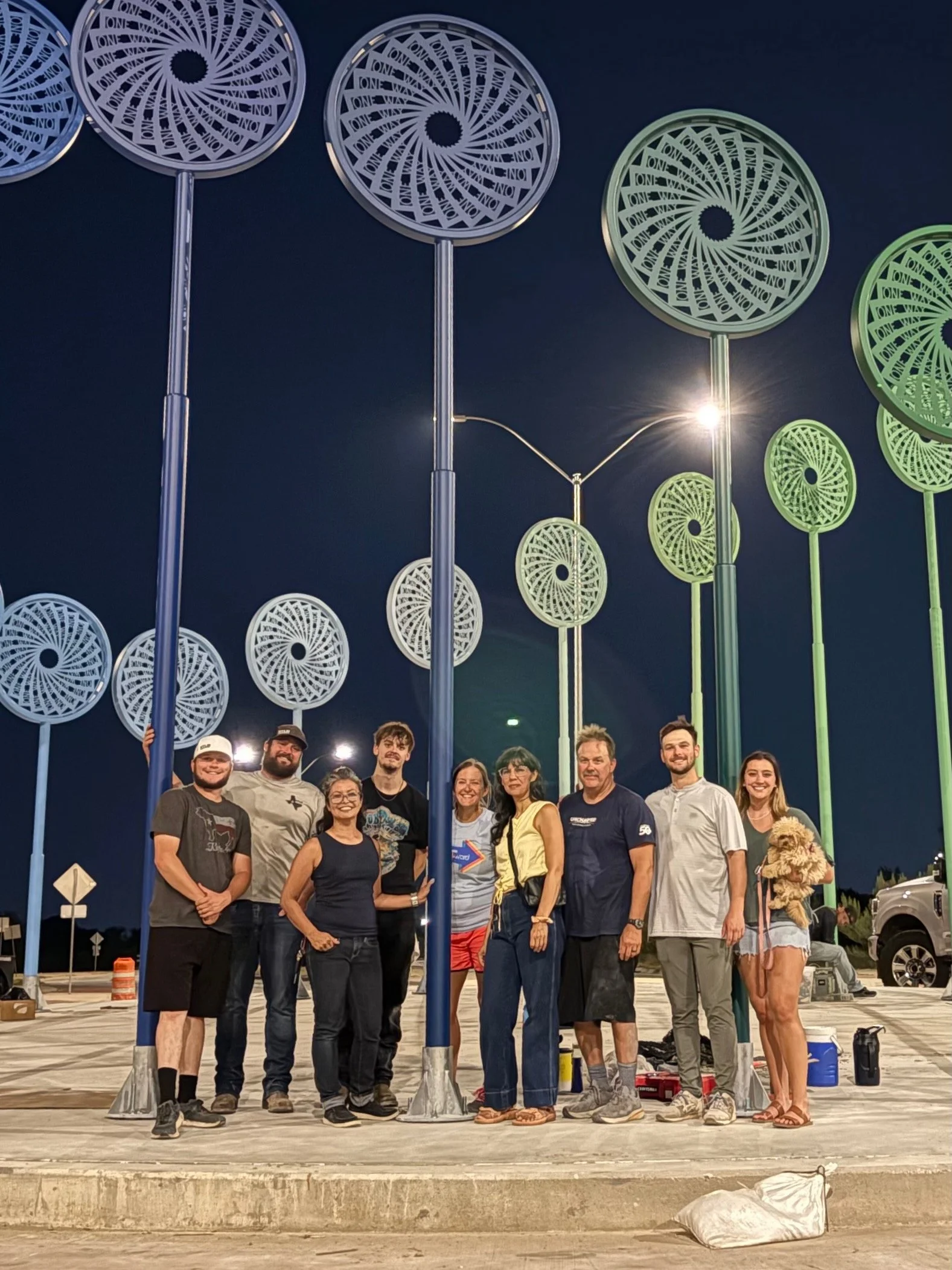 From sketches and steel to 24 metal sculptures rising like a field in bloom, shifting as one passes by, catching sunlight and shadow. Designing, presenting, re-presenting, fabricating, welding, painting, transporting, and, finally, installing in the Texas summer heat.